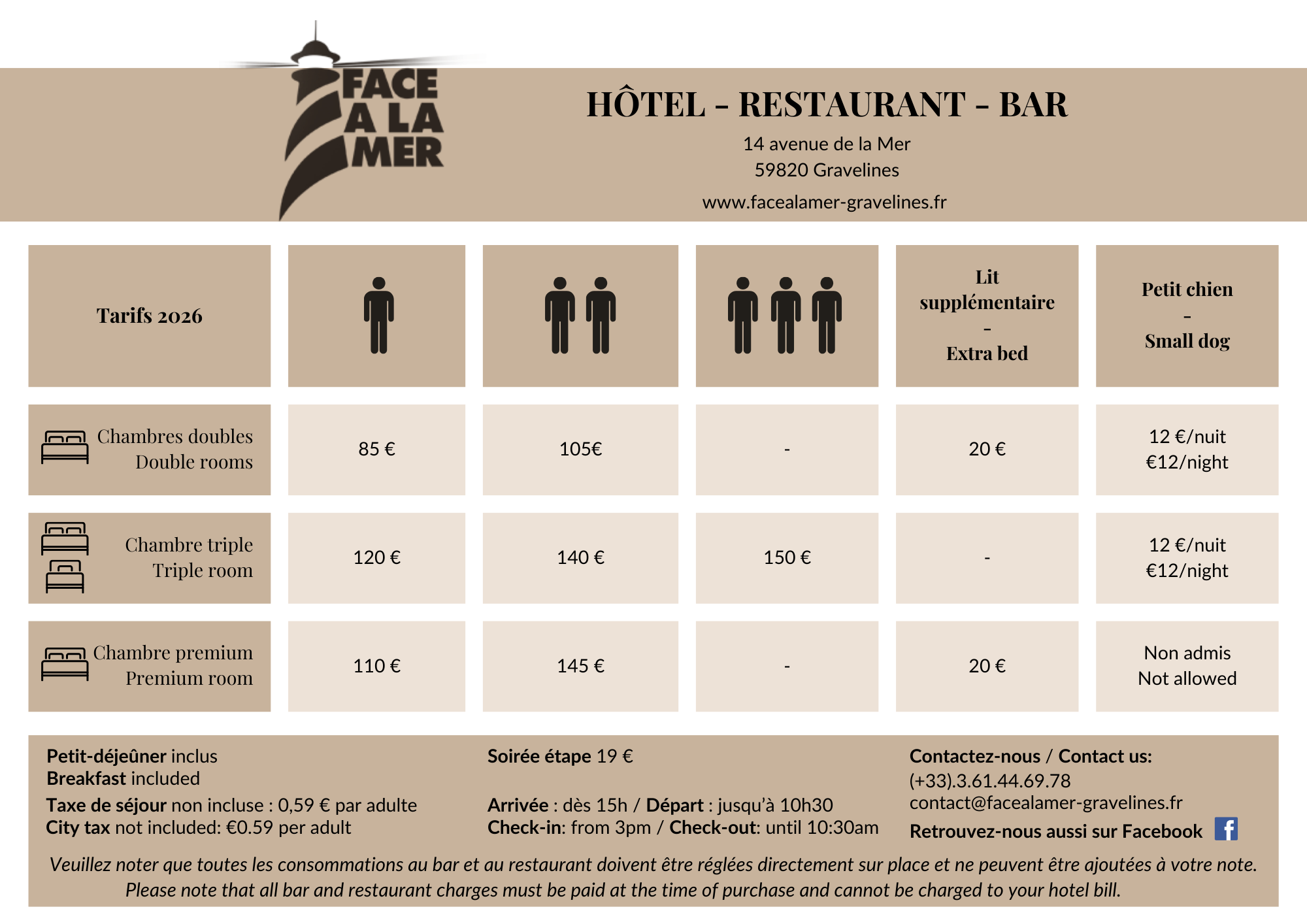 Profitez du charme et du calme de l'hôtel Face à la Mer. Situé en bord de plage, notre établissement vous garantit une vue imprenable, que ce soit sur la Mer du Nord ou le Phare de Gravelines. Vous apprécierez, durant votre séjour, de l'accès direct à la plage de Gravelines et des nombreuses activités disponibles sur place.
